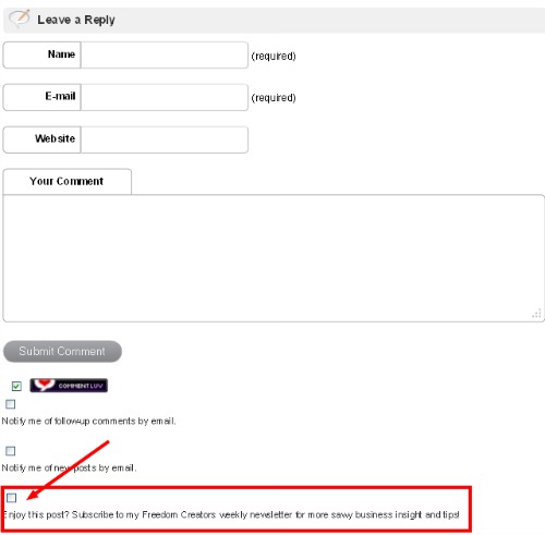 It let’s you add a newsletter widget, if your a bit more advanced, you can add shortcodes and my favorite, you can have a “sign me up” checkbox for your comment form. Much less intrusive than an annoying pop up.